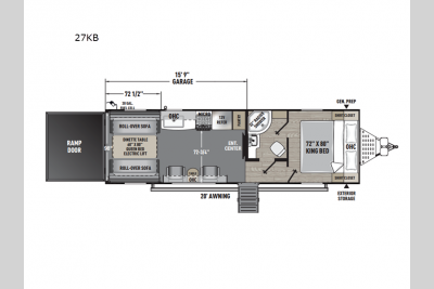 Load up everyone and your motorcycles, bicycles, or off-road toys to enjoy some trail rides and overnight accommodations! You will find sleeping space for six people thanks to the electric queen bed with dual roll-over sofas underneath in the garage, and the walk-around king bed in the front master bedroom. You can keep your toys fueled and ready to go with the 30 gallon fuel station and the zero gravity ramp door will allow for easy loading and unloading. This travel trailer toy hauler includes all the kitchen appliances to create meals each day and the dual entry bath is accessible from the front master bedroom and the hallway for your guests. You will also find a rear pull down screen, pull-down roller night shades to be able to sleep in late, and a 300W Solar Panel with MPPT control charger to help you stay off-grid.
