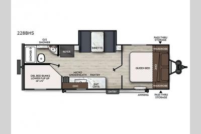 Sleeps 7 Slides 1 Length 27 ft 8 in Ext Width 7 ft 6 in Ext Height 10 ft 2 in Hitch Weight 536 lbs GVWR 6000 lbs Dry Weight 4632 lbs Cargo Capacity 1368 lbs Fresh Water Capacity 52 gals Grey Water Capacity 35 gals Black Water Capacity 35 gals Number Of Bunks 2 Available Beds Queen Refrigerator Type 12V Refrigerator Size 10 cu ft Cooktop Burners 2 Number of Awnings 1 LP Tank Capacity 20 lbs Water Heater Type On Demand Tankless AC BTU 15000 btu Awning Info Power w/LED Lights Axle Count 2 Number of LP Tanks 2 Shower Type Standard Electrical Service 55 amp Solar Wattage 400 watts Similar Travel Trailer Floorplans