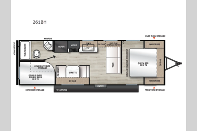 You get to choose to sit at the sofa or at the booth dinette when you are relaxing inside. There is a shelf with storage totes above the sofa for your belongings, and an additional overhead cabinet above the dinette for games. Maybe you want to rest on your own queen bed in the front semi-private bedroom before you make a meal in the kitchen or take a hike through the trails around the lake. The 15' electric awning with multi-color LED lights and a remote offers an outdoor living area where you can visit with other RVers. The kids will love their own double-size bunks that they can share with a friend or two, and the full bathroom is nearby as an added convenience.