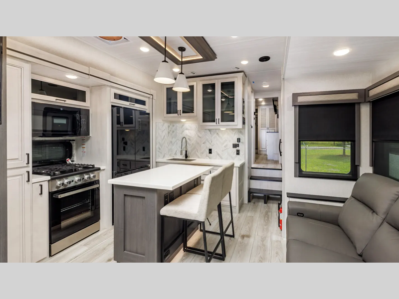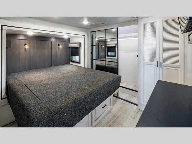 The 102" wide-body chassis and drop-frame front storage compartment make it so easy to load in dirt bikes, kayaks, and all the riding gear, and there is an all-weather ramp door for hassle-free unloading. A MORryde CRE 3000 suspension comes standard for smooth towing, and you are sure to appreciate the Furrion Vision S RV 3-camera system so you can maneuver in and out of campgrounds without an issue. Some of the premium features you'll enjoy inside are the solid surface countertops with flip-up countertop extensions, day and night Slow Rise roller shades, soft close hardwood raised panel cabinet doors, and so much more!