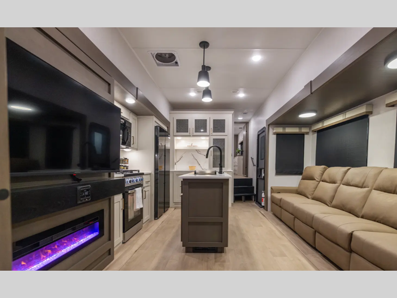 Sleeps 4 Slides 3 Length 40 ft 10 in Ext Width 8 ft Ext Height 13 ft 3 in Hitch Weight 2120 lbs Dry Weight 12619 lbs Cargo Capacity 3501 lbs Fresh Water Capacity 64 gals Grey Water Capacity 108 gals Black Water Capacity 44 gals Furnace BTU 35000 btu Available Beds King Refrigerator Type 12V Refrigerator Size 16 cu ft Cooktop Burners 4 Number of Awnings 2 LP Tank Capacity 30 lbs Water Heater Type On Demand Tankless AC BTU 27000 btu TV Info LR 65" TV Awning Info 14' and 18' Power w/LED Lights Axle Count 2 Washer/Dryer Available Yes Number of LP Tanks 2 Shower Type Standard Electrical Service 50 amp Solar Wattage 200 watts Similar Floorplans