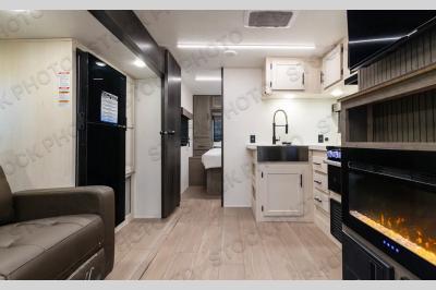 Looking for the perfect trailer for two with a spacious bathroom and bedroom? This Alpha Wolf provides a rear oversized bathroom complete with linen storage and a sliding door that saves space and looks great. The front bedroom includes a walk-around queen bed, dual wardrobes, a sliding door plus windows for natural lighting and great views. The main living and kitchen area is spacious as well with a large slide out that includes theater seating with a removable table across from the entertainment center with a fireplace, a 12V residential style refrigerator for lots of cold storage, and a pantry for your snacks and dry goods. You can decide to cook indoors on the three burner cooktop, or head outdoors to cook on the outside kitchen!