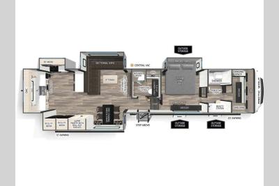 Some of the top features you'll find on these fifth wheels are an armored underbelly tank enclosure and forced air heat, an automatic leveling and stabilization system, and a Juice Pack solar system. Interior features continue on with solid surface countertops with underlighting, fully adjustable, slow rise, blackout roller shades in the main living area, and a pet friendly "Clean Sweep" floor design with no heat vents.