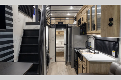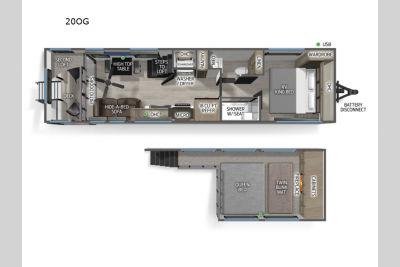 This model is similar to 16ML but larger! A bigger bathroom, RV king bed in the lower master, and a queen bed plus a twin bunk mat in the front loft. And the second loft can be utilized as extra sleeping space or storage space! There is an 18 cu. ft. refrigerator so you can stock up for a week long vacation, a hide-a-bed sofa that can transform into added sleeping for guests, and a high top table with two stools to dine at. The bathroom below is split with a shower on one side, and a private toilet area and sink opposite. And the view is amazing from just about anywhere inside.