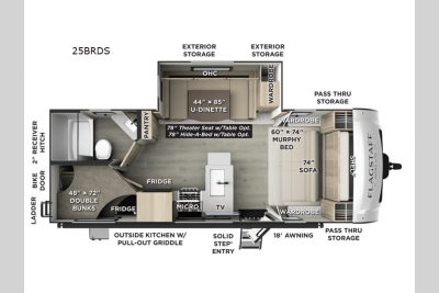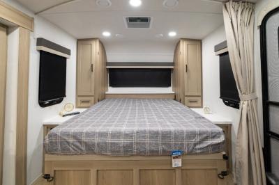 Each model is constructed with a fully laminated walkable roof, 6-sided full-aluminum frame, and a fiberglass front cap with Clear Coat for added protection. You will appreciate the slam baggage doors and 200W solar panel outside, plus there is a Climate Protection Package for better insulation. Inside, you'll love the solid surface countertops, roller shades, and soft close roller bearing drawers.