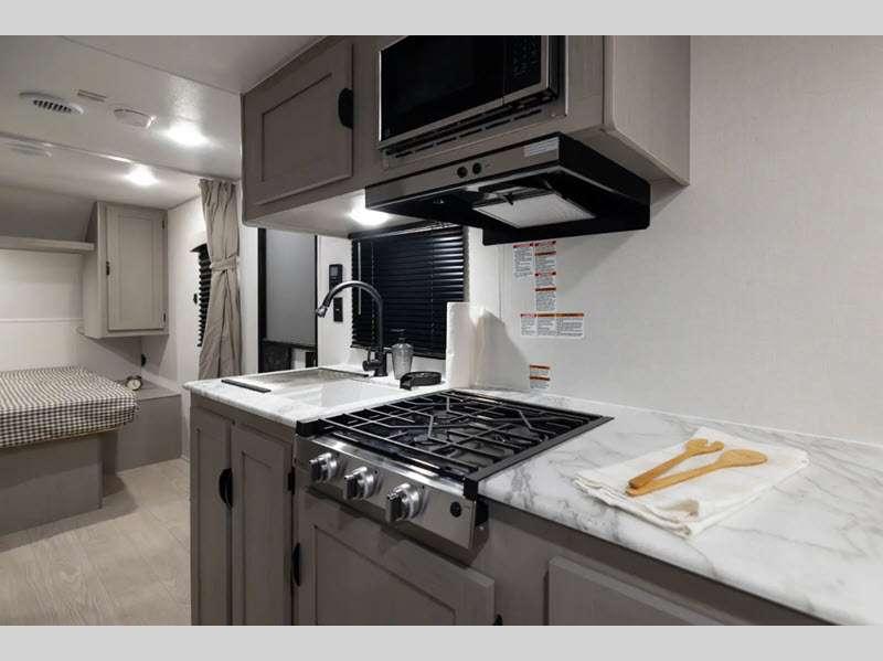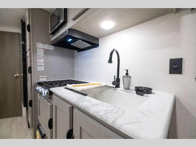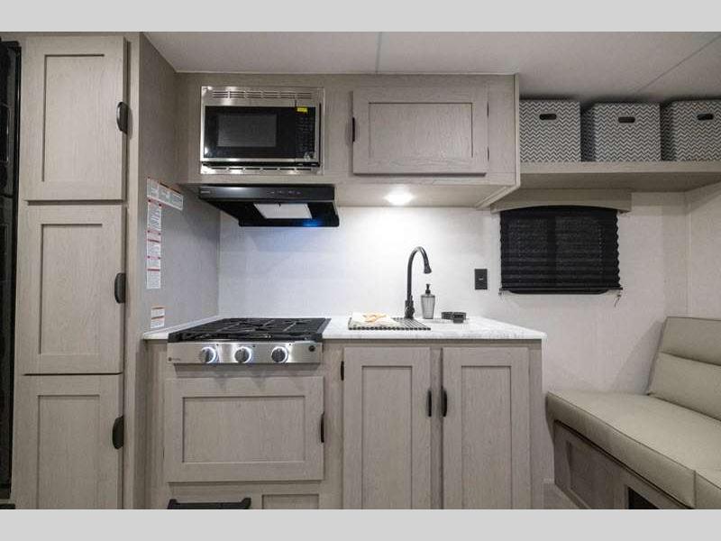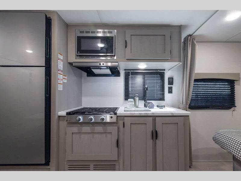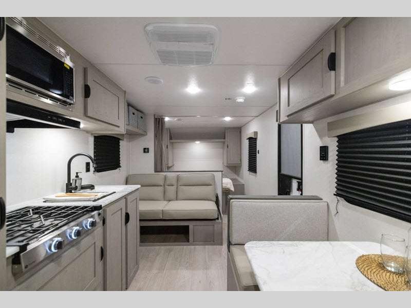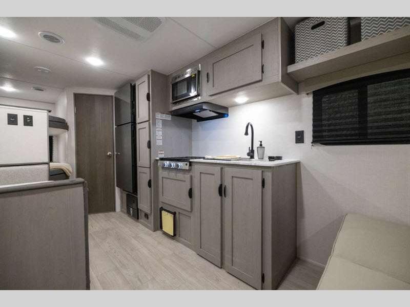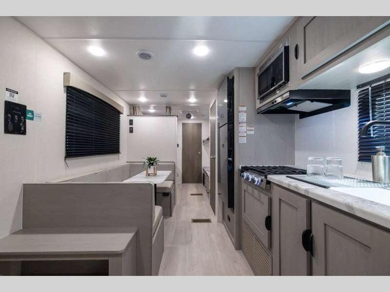 Sleeps 4 Length 26 ft 10 in Ext Width 8 ft Ext Height 11 ft Hitch Weight 700 lbs GVWR 7700 lbs Dry Weight 4724 lbs Cargo Capacity 2976 lbs Fresh Water Capacity 40 gals Grey Water Capacity 32 gals Black Water Capacity 32 gals Furnace BTU 20000 btu Available Beds RV Queen Refrigerator Type 12V Refrigerator Size 10 cu ft Cooktop Burners 3 Shower Size 24" x 36" Number of Awnings 1 Water Heater Type Tankless On Demand AC BTU 13500 btu Awning Info 18' Power with LED Light Strip and Adjustable Legs Axle Count 2 Shower Type Tub/Shower Combo Similar Floorplans