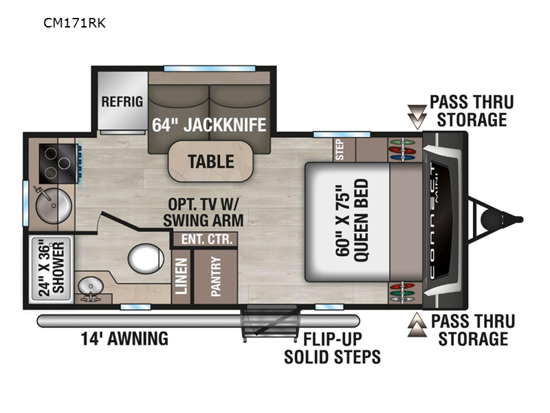 Sleeps 3 Slides 1 Length 21 ft 6 in Ext Width 7 ft 6 in Ext Height 10 ft 5 in Int Height 6 ft 6 in Hitch Weight 540 lbs GVWR 4800 lbs Dry Weight 4090 lbs Cargo Capacity 710 lbs Fresh Water Capacity 36 gals Grey Water Capacity 32 gals Black Water Capacity 32 gals Tire Size 15" Available Beds RV Queen Refrigerator Type 12V Refrigerator Size 8 cu ft Cooktop Burners 3 Number of Awnings 1 Axle Weight 3550 lbs LP Tank Capacity 20 lbs Water Heater Type Tankless AC BTU 13500 btu Cargo Deck Size 0 ft Awning Info 14' Power with LED Light Strip Axle Count 1 Number of LP Tanks 1 Shower Type Standard Similar Travel Trailer Floorplans