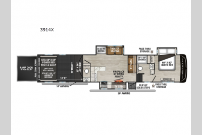 Sleeps 8 Slides 3 Length 44 ft 5 in Ext Width 8 ft 4 in Ext Height 13 ft 5 in Int Height 8 ft 6 in Hitch Weight 3100 lbs GVWR 20000 lbs Dry Weight 14680 lbs Cargo Capacity 5320 lbs Fresh Water Capacity 100 gals Grey Water Capacity 50 gals Black Water Capacity 90 gals Tire Size 16 Furnace BTU 30000 btu Fuel Capacity 30 gals Number Of Bunks 1 Available Beds Queen Refrigerator Type 12V w/Temperature Controls Refrigerator Size 16 cu ft Cooktop Burners 3 Shower Size 36" x 30" Number of Awnings 2 Axle Weight 11580 lbs Garage Size 13 ft 6 in LP Tank Capacity 60 Water Heater Capacity 42000 gal Water Heater Type Tankless TV Info LR LED TV Awning Info 14' & 20' Power Awning(s) w/LED Light Strip Axle Count 3 Washer/Dryer Available Yes Shower Type Standard Similar Toy Hauler Fifth Wheel Floorplans