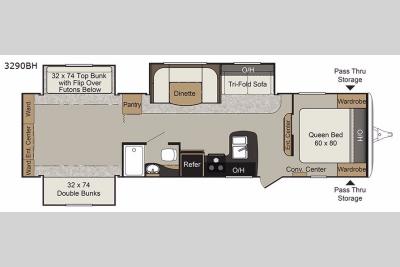 A bunkhouse model is specifically designed to house a bunk-bed section so that you can sleep even more people in your RV. Perfect for families with children, a bunkhouse takes the joy of RVing and mixes it in with the excitement of a sleep over. Bunkhouses also save space by consolidating sleeping arrangements, meaning that more of your interior square footage goes towards utility. There are so many amazing bunkhouse floorplans for you to get excited about at incredibly affordable prices here at RV Value Mart!